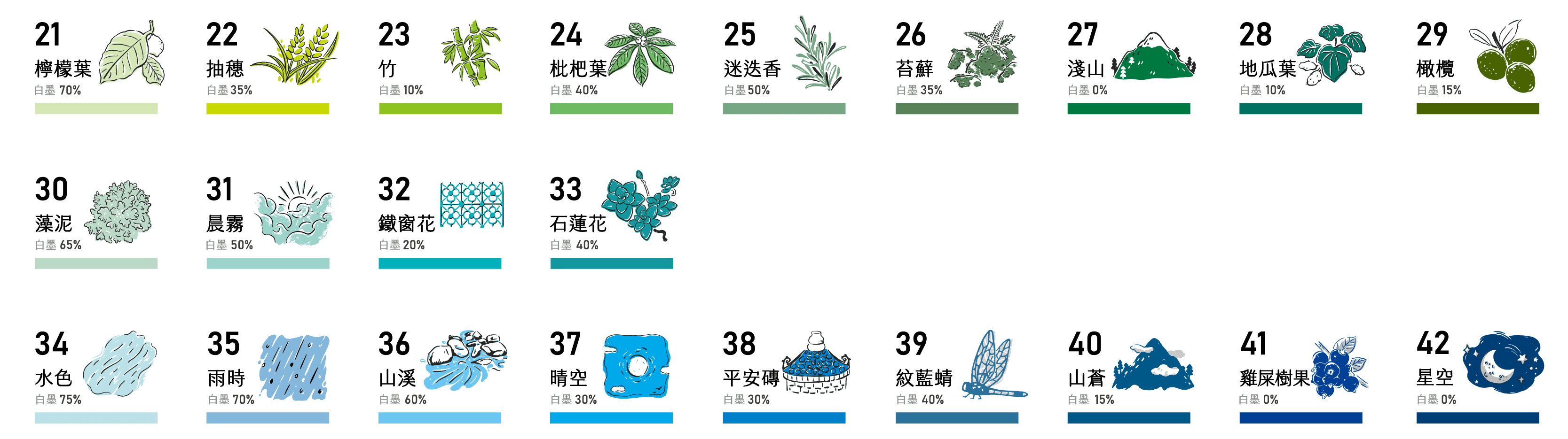 東海歲時藏色票23 - 竹 / 綠 白墨比例10% Pantone色號 4212 C CMYK參考值 50 0 100 0 小小罐 50克|100元 小罐 100克│ 150元 ( ★一般用量 )...