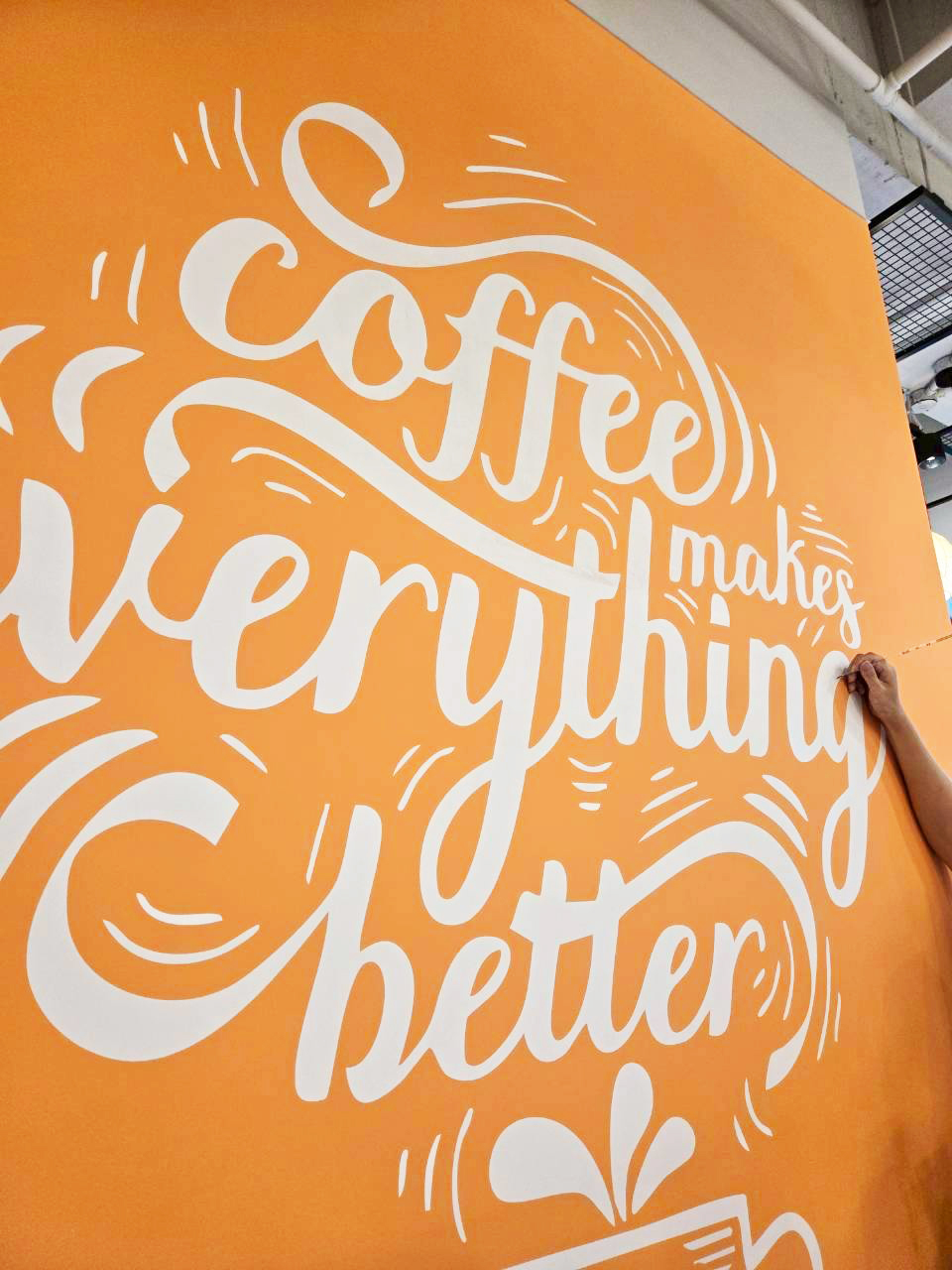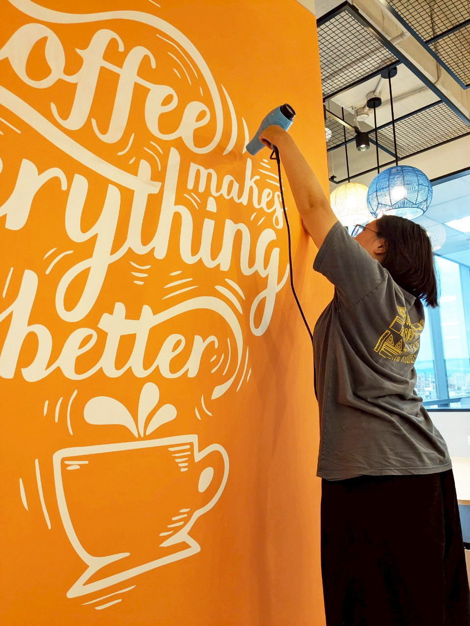 為台元科技完成牆面絹印,橘色牆、白色手寫字,「Coffee makes everything better」印上去的瞬間,這個空間就有了自己的態度