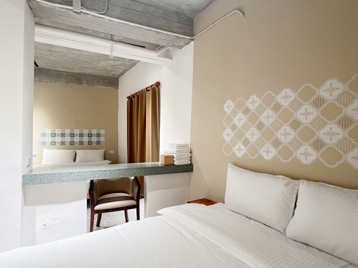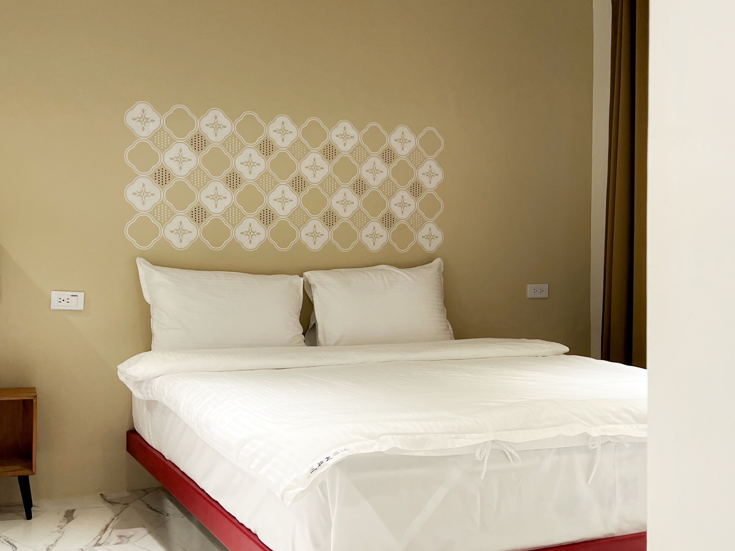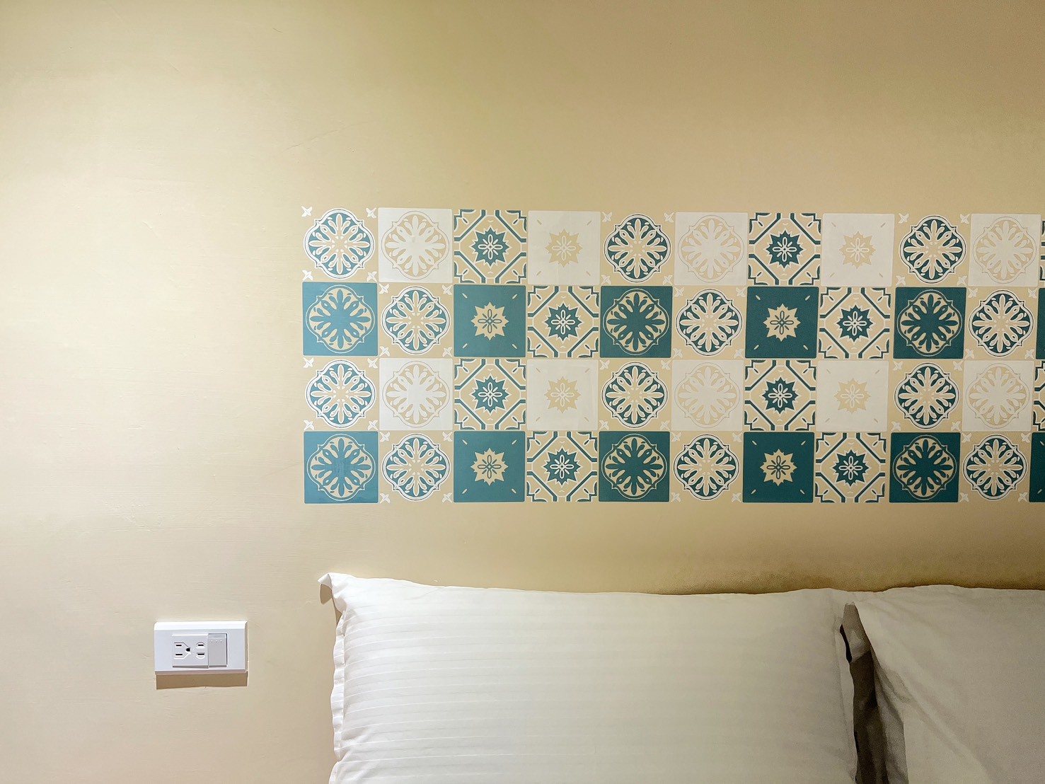 共11間客房床頭牆印上工作室設計的 【四角花磚2號】 、印花樂的 【老磁磚4號】 、【海棠玻璃7號】單色版及雙色版