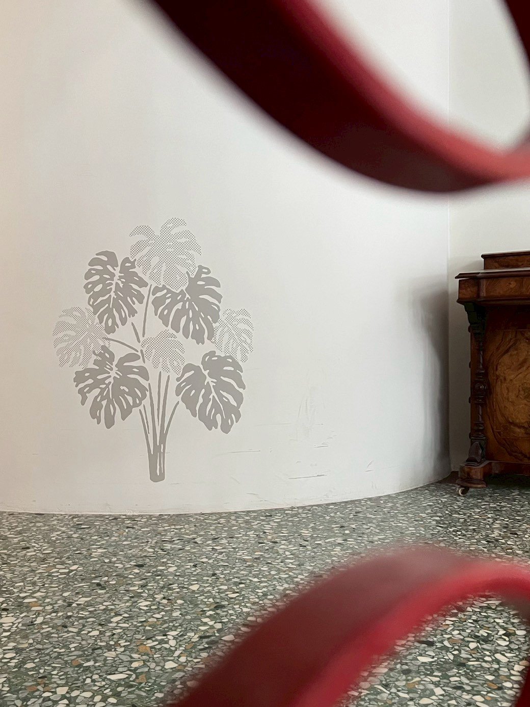 在樓梯轉角牆印上與 in Blooom 印花樂 聯名的 【海棠玻璃7號】