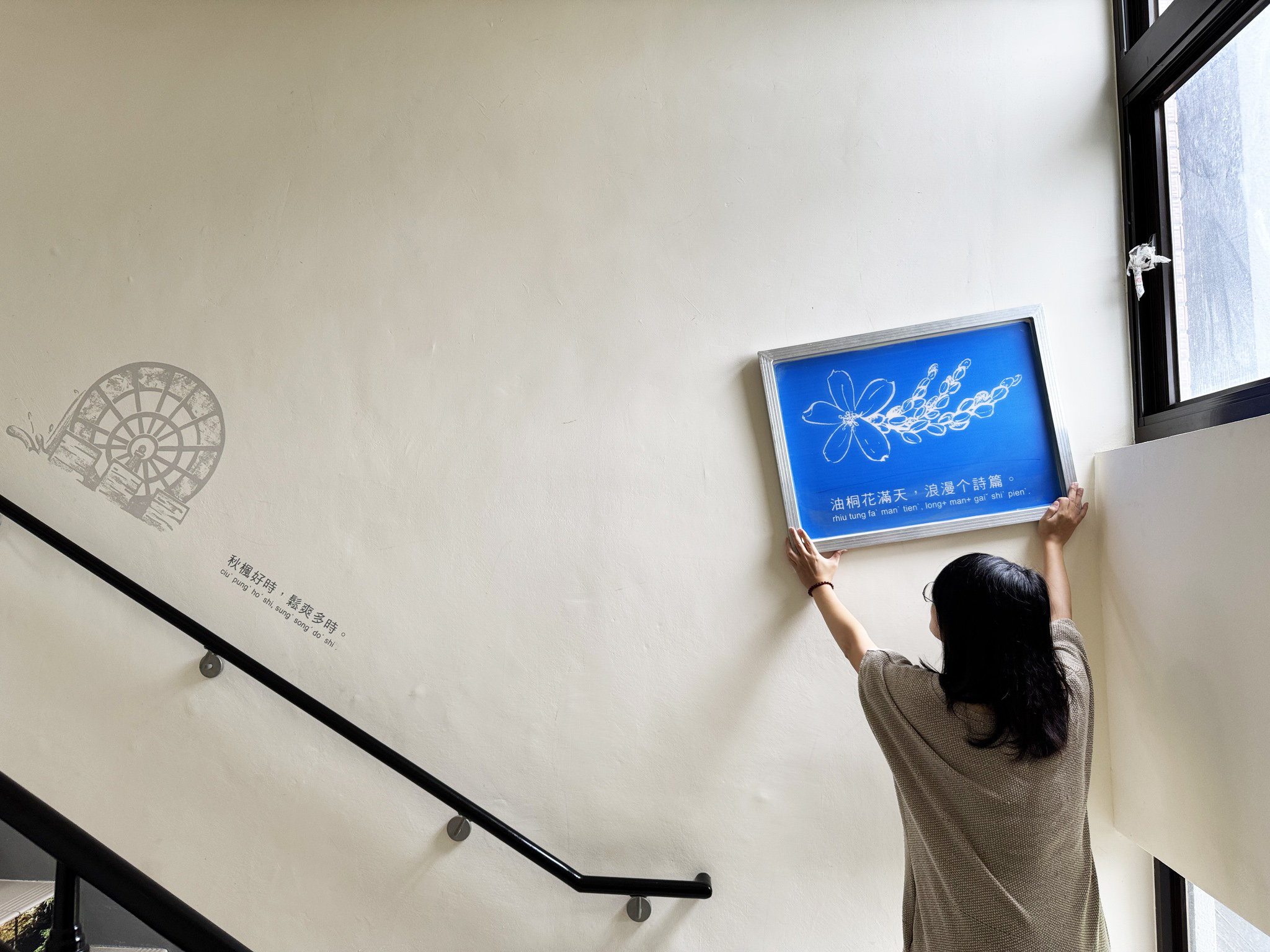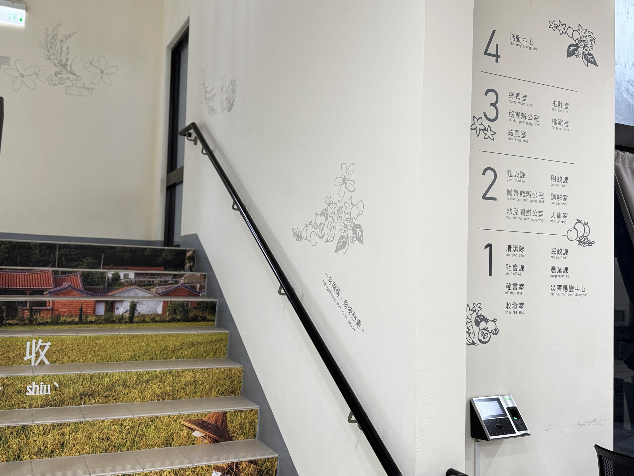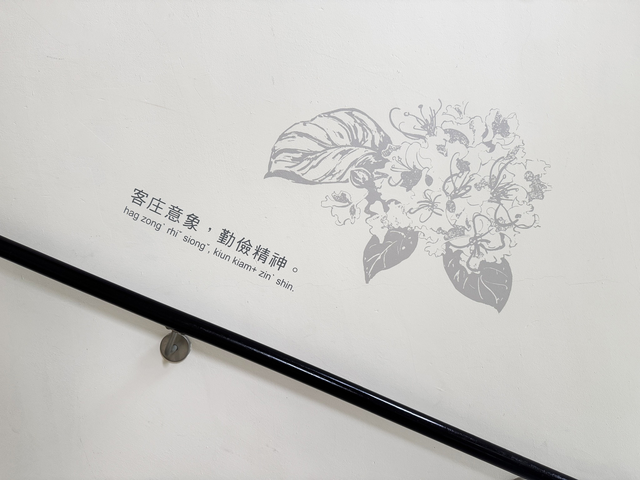 再從歡迎牆中的元素重組、重複排列出現在一到四樓的梯間,而扶手旁的客語短句,更像小彩蛋般,讓人邊走邊發現地方文化的韻味。