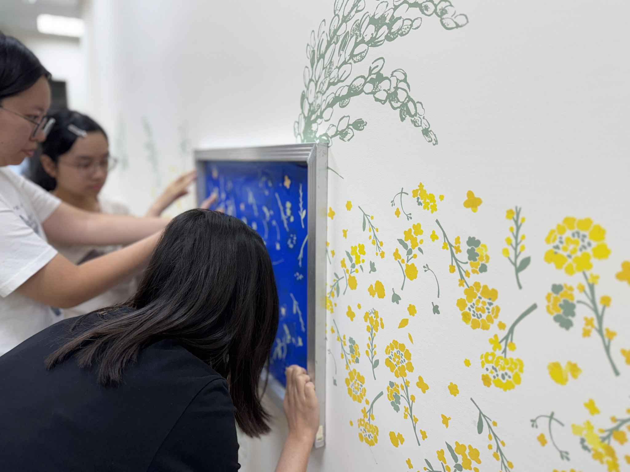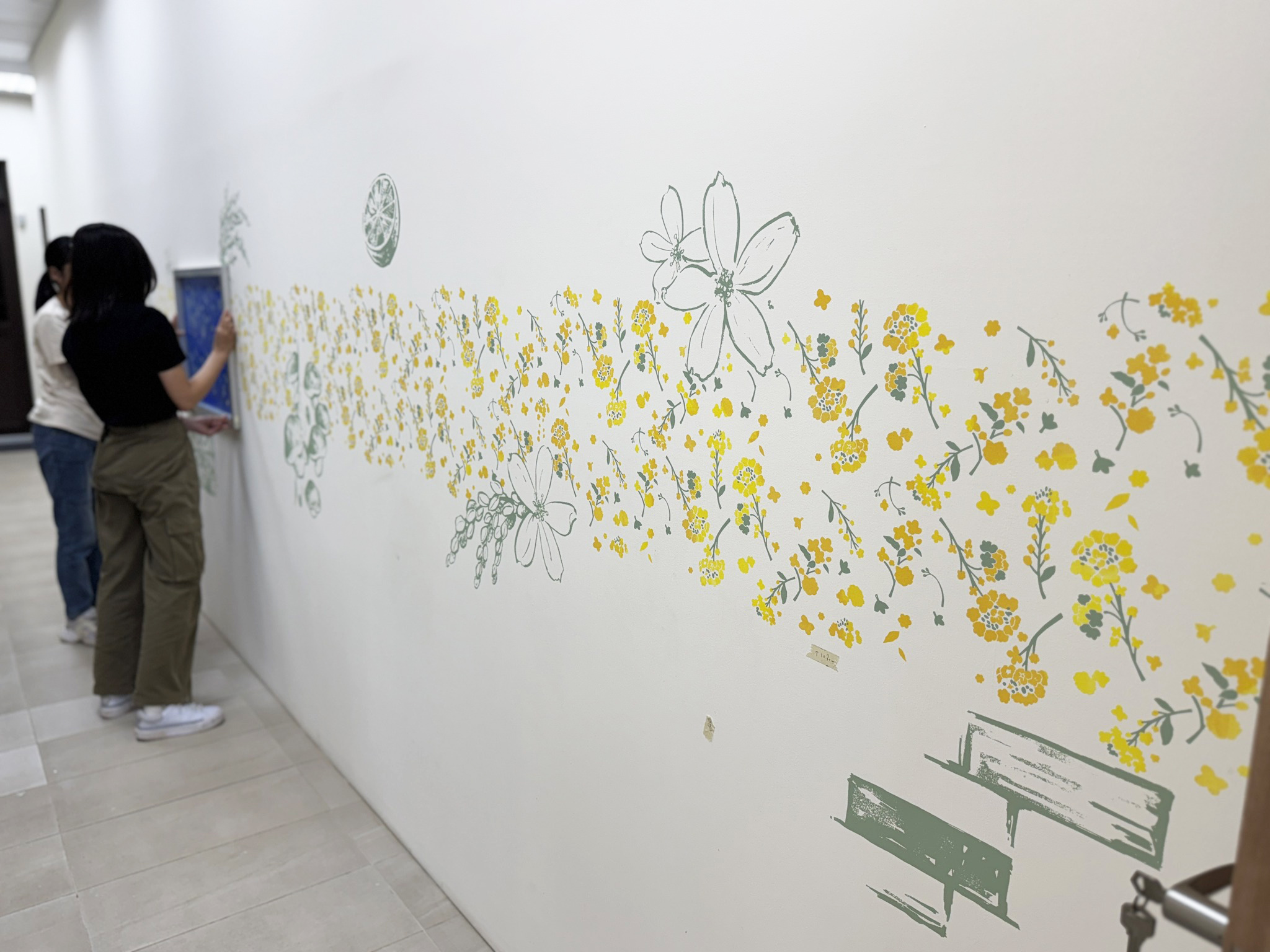 原先一樓的空白廊道,絹印上我們與 in Blooom 印花樂 聯名授權的油菜花套色印花,讓日常的走道變成亮眼的「網美打卡點」。