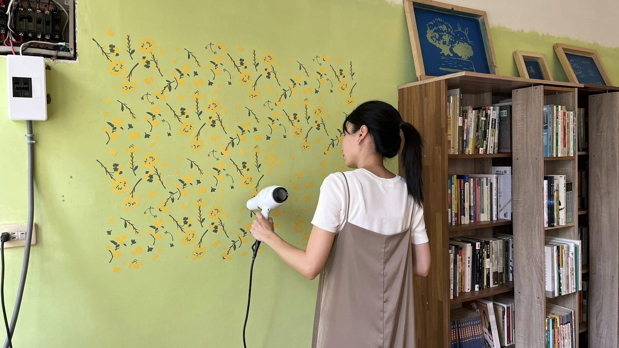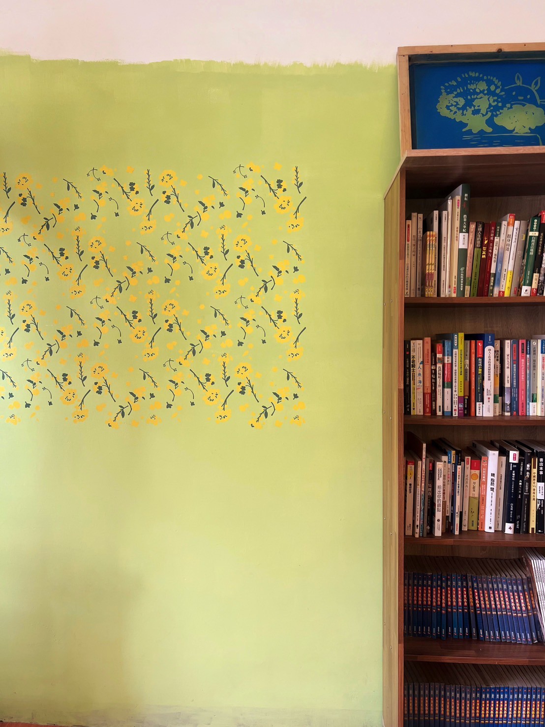 #絹印施工 #牆面絹印 #牆面印花 #牆壁絹印 #牆面印刷 讀/獨有書、行有書,獨行有書 牆面印花絹印 / 2025.07 Mar 25. 2026 位於東海窟的 獨行有書 是一間獨立書店,店長自稱是農姑娘,因為不只兼顧書店還要下田耕作,種出一片美麗的蕎麥田~ 近期更開發出不少蕎麥周邊美食及用法 這次準備印刷的圖案是和印花樂合作系列中的油菜花款式,有著頑強生命力的油菜花也為這個空間增添不少活力 課程、活動邀請! 請洽:玩印FB私訊、玩印官方網站 : 牆壁絹印