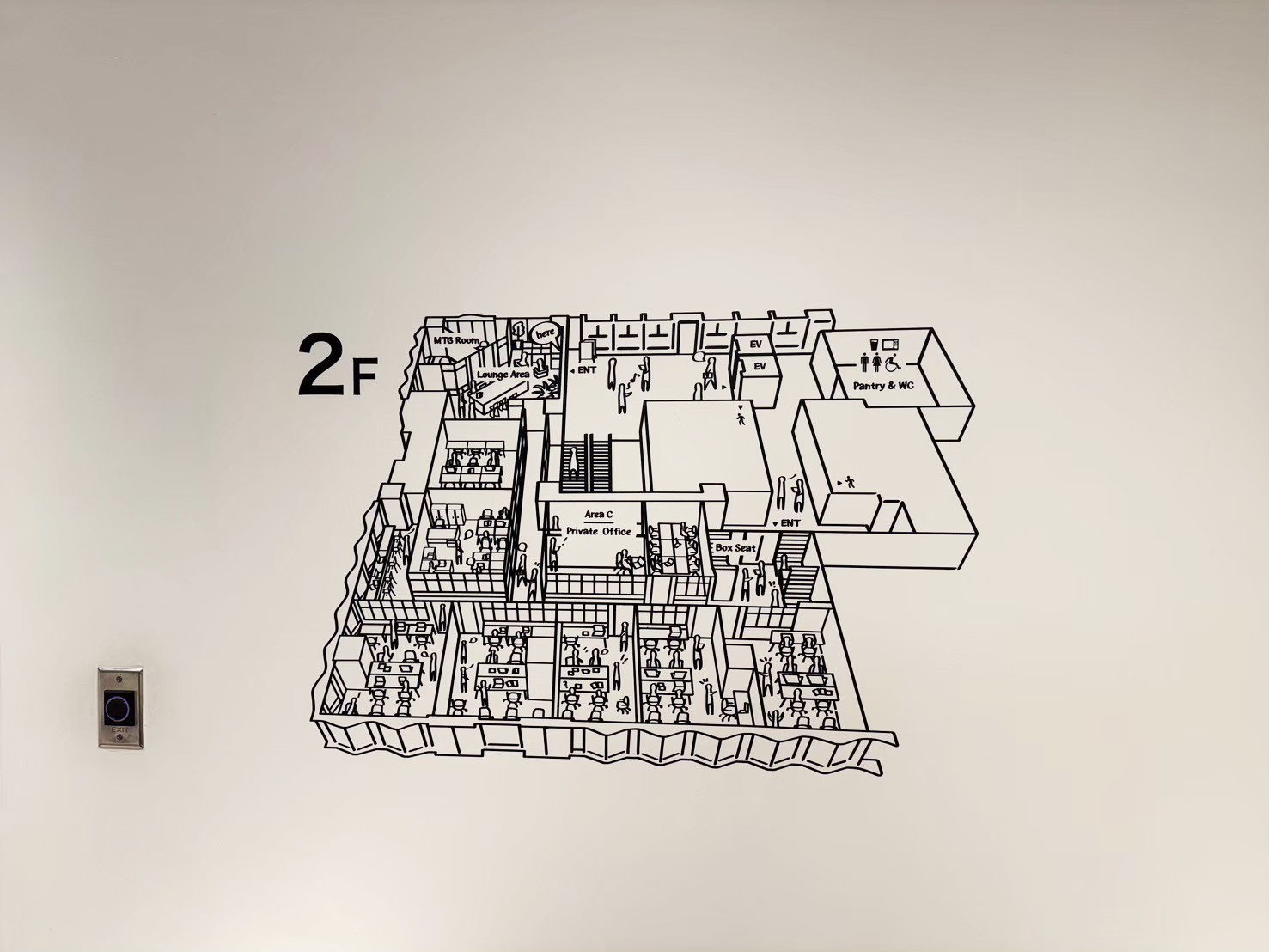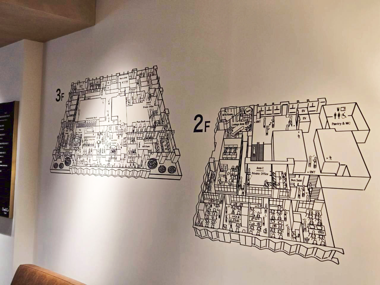 這次來到 One&Co 共享辦公空間,把 2F、3F 的樓層平面圖以等角視角絹印上牆——座位區、會議室、廁所,細節多到印的時候不敢馬虎~