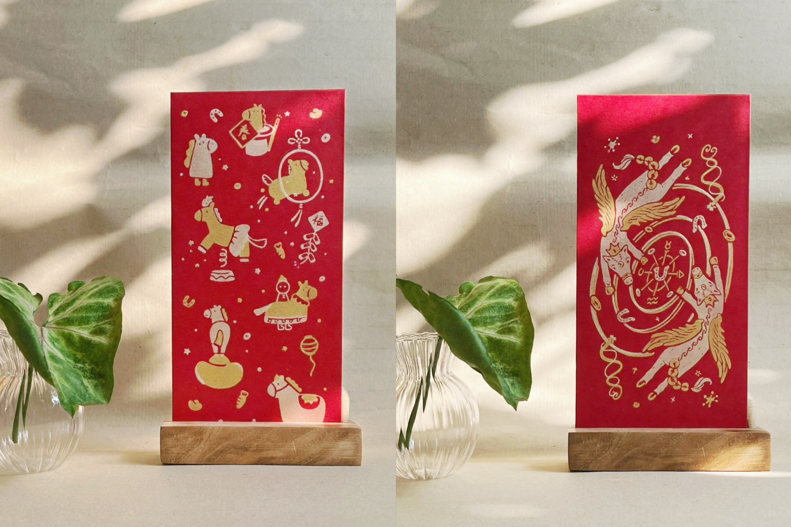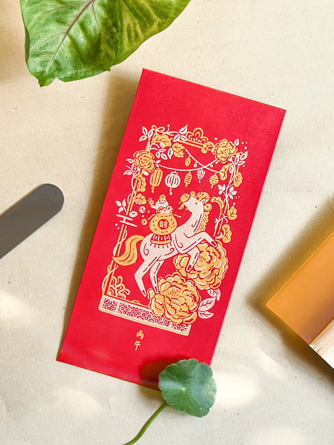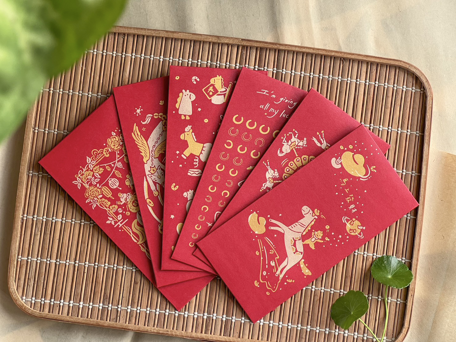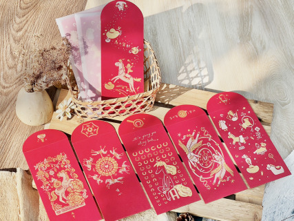 紅包袋象徵著好運和吉祥,包紅包在傳統中代表著對他人的祝福,希望他們在新的一年裡平安幸福。採雙色套印方式分版印刷,以特殊色-金色、淺金色搭配,每款需印製兩次。