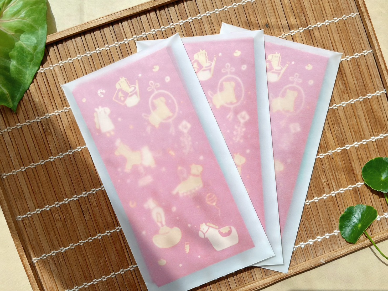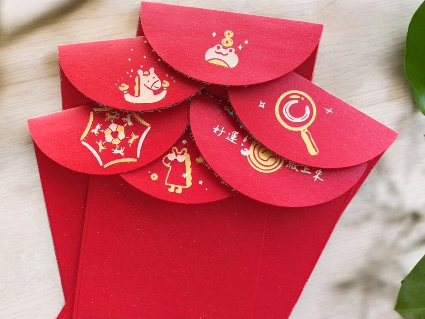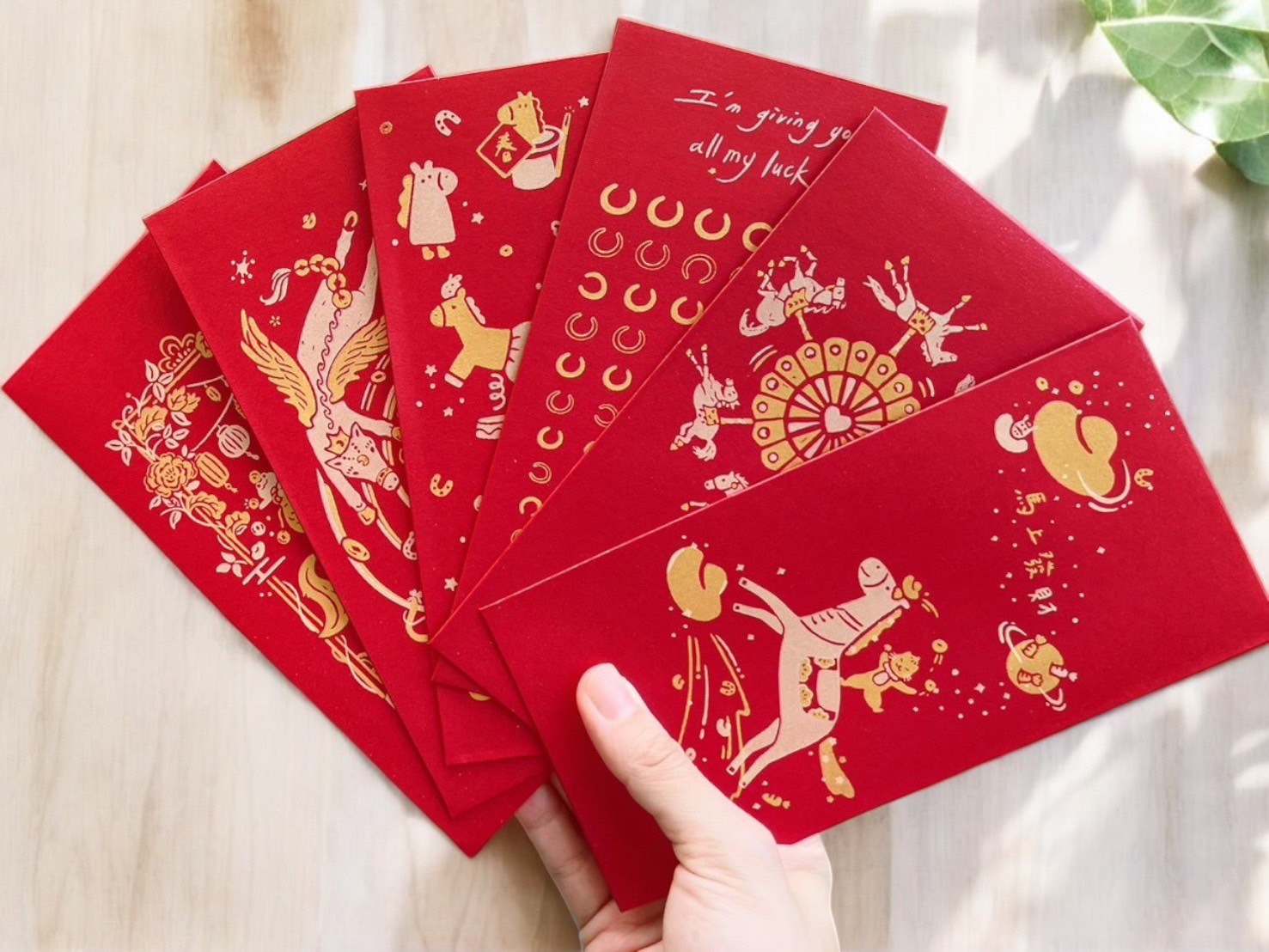 紅包袋象徵著好運和吉祥,包紅包在傳統中代表著對他人的祝福,希望他們在新的一年裡平安幸福。採雙色套印方式分版印刷,以特殊色-金色、淺金色搭配,每款需印製兩次。