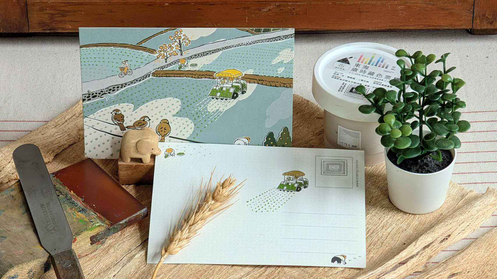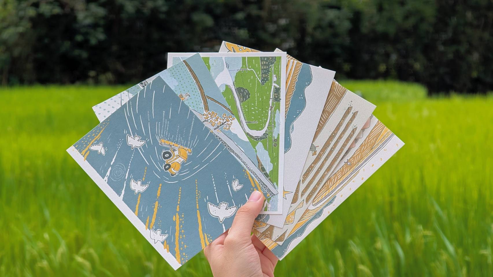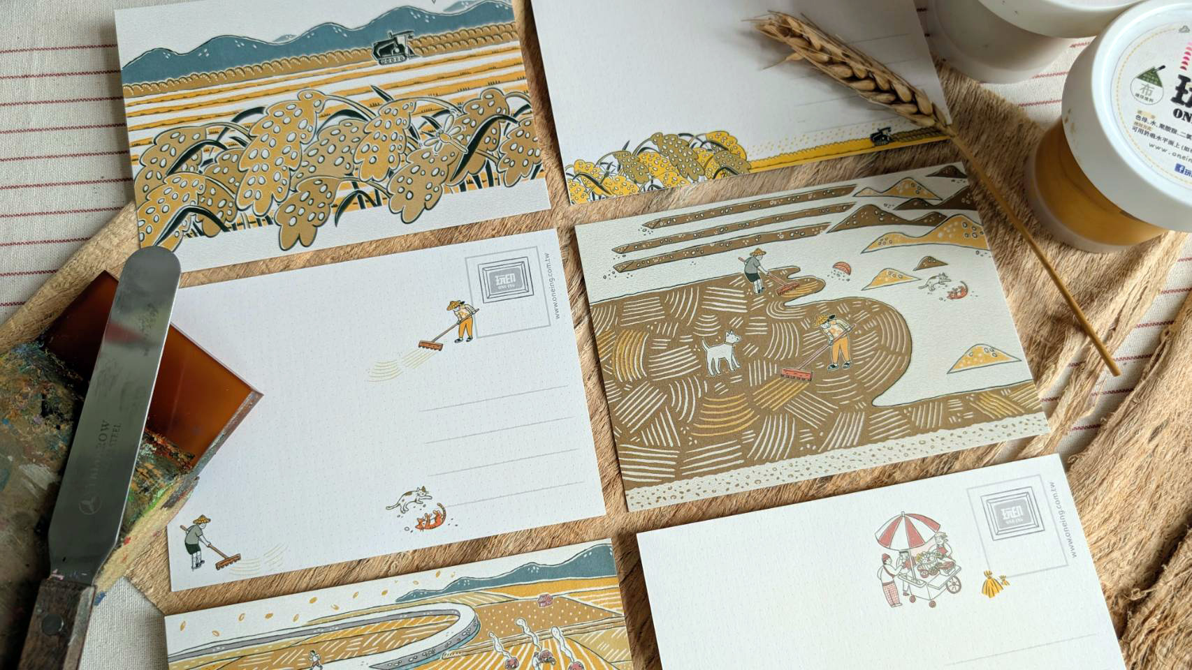東海是二期稻作,四時運轉的變化,輸出搭配傳統手感絹印,每次印刷一張,每份需絹印六次,製作耗時細膩。