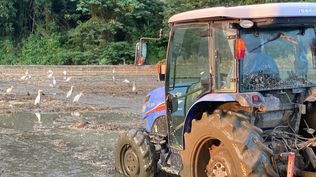 曳引機放下犁後開始整地翻土,鬆土轉水田,鳥飛伴春容。