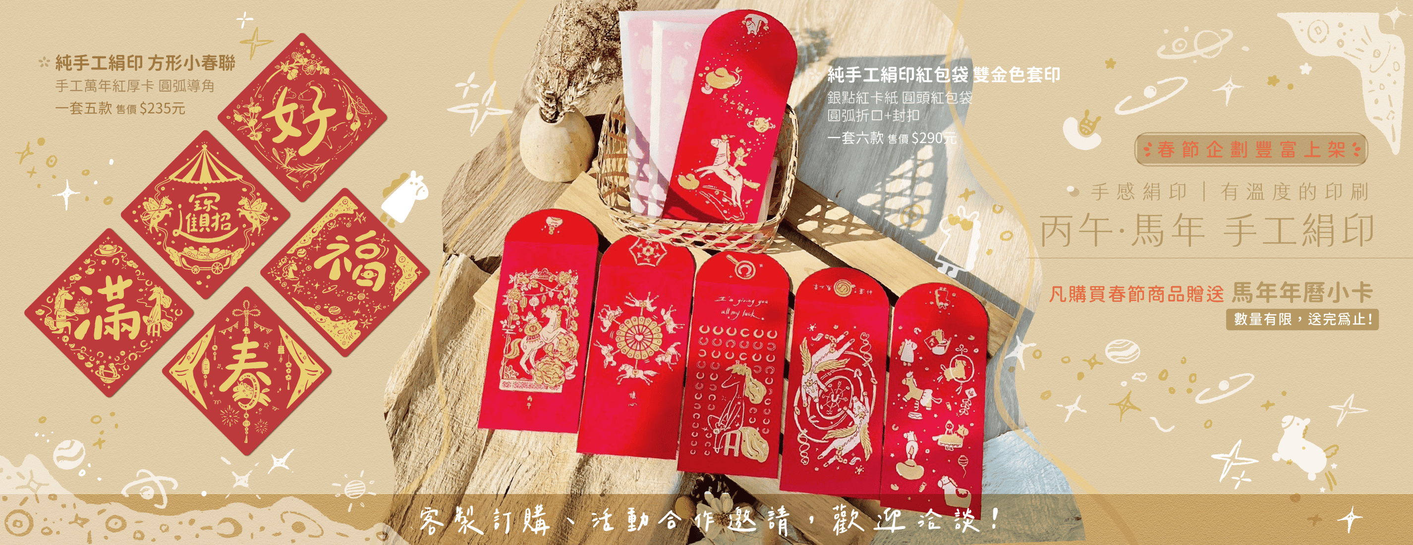 就像我們在工作室反覆套色、調整網版的日子,每件作品都藏著手工的驚喜與祝福,願這份純手繪、純手工絹印的紅包與春聯,成為您迎接新春的溫暖儀式。