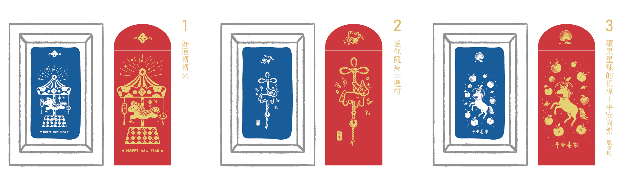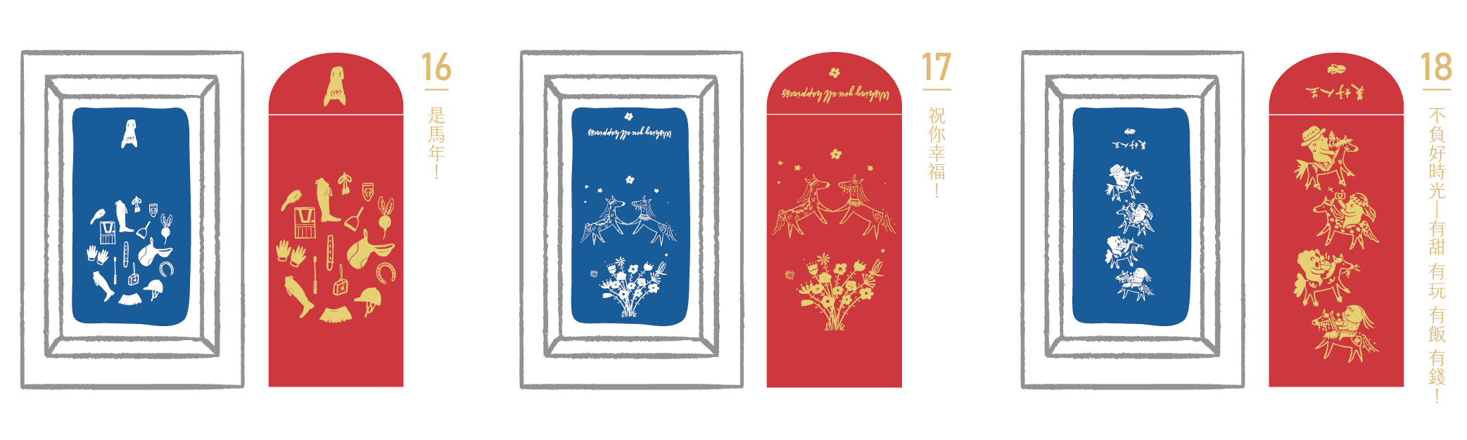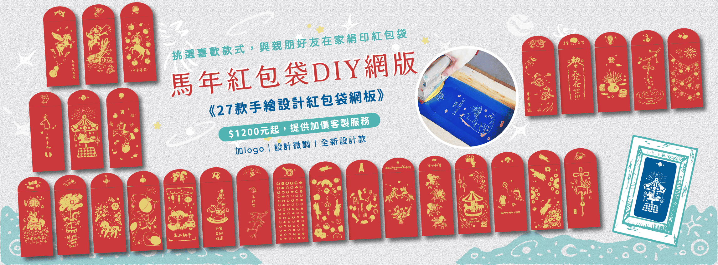 每年工作室都會接到許多春節的設計,在創作年度的紅包袋商品時,也有許多很有特色但未納入成品的圖案;今年特別將馬年手繪圖稿設計為27款DIY紅包袋,希望讓不便前來工作室體驗的朋友,也可以購買網版、工具、油墨等,在家與親朋好友一起玩絹印喔!