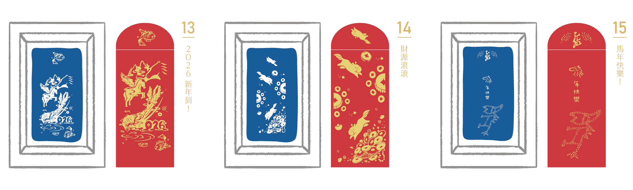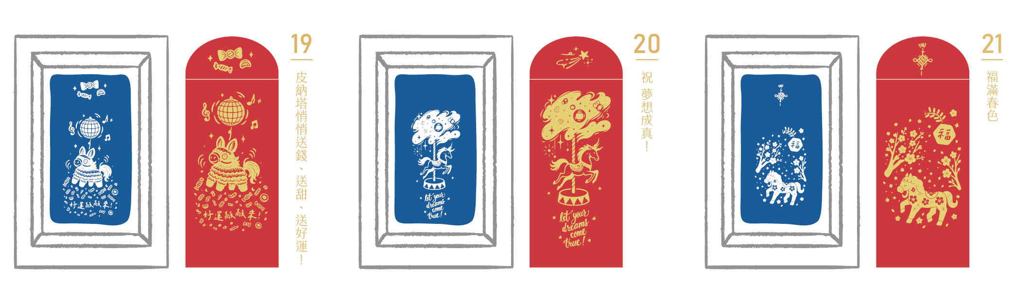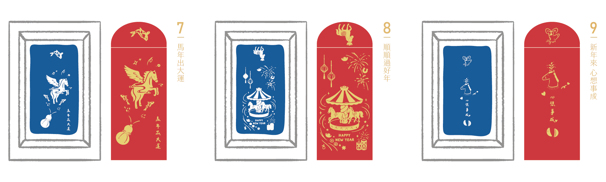每年工作室都會接到許多春節的設計,在創作年度的紅包袋商品時,也有許多很有特色但未納入成品的圖案;今年特別將馬年手繪圖稿設計為27款DIY紅包袋,希望讓不便前來工作室體驗的朋友,也可以購買網版、工具、油墨等,在家與親朋好友一起玩絹印喔!