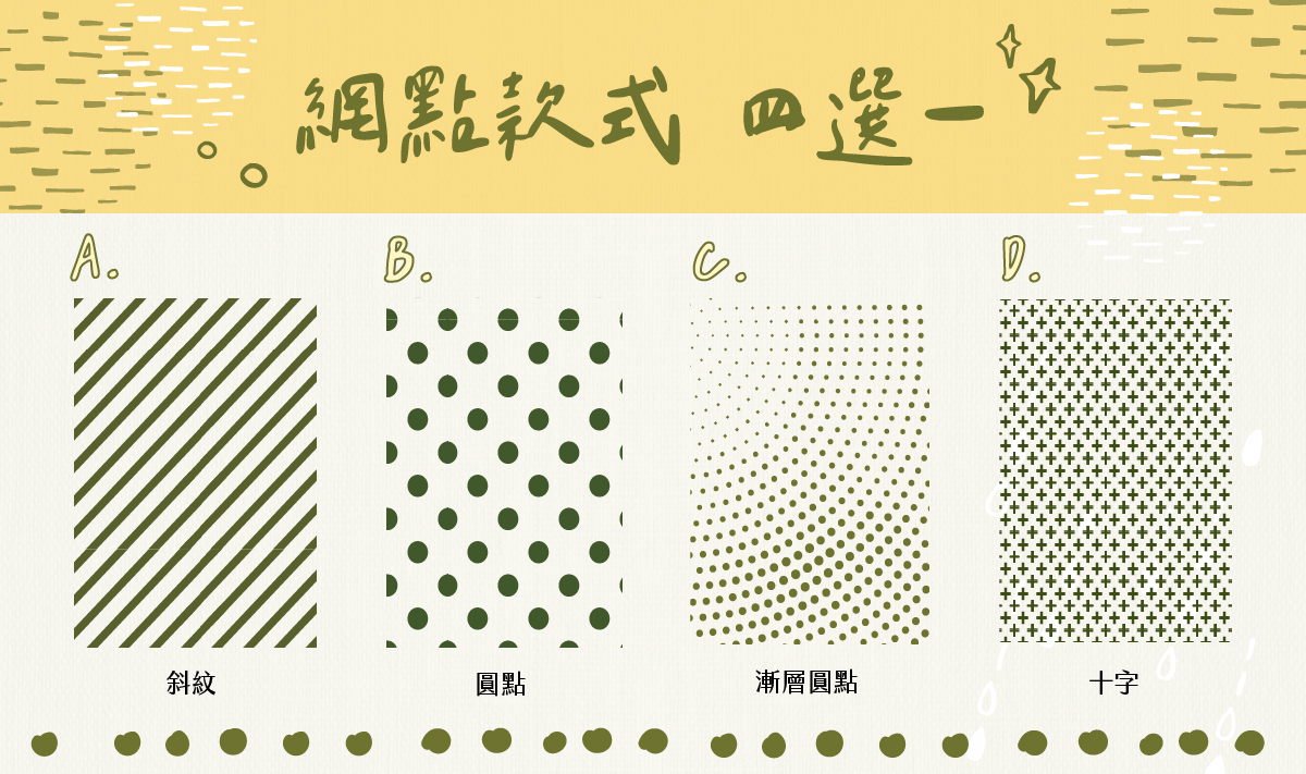 每人可繪製20*28 cm 的套色圖案 (套色完成圖約為20*14),提供多款網點選擇