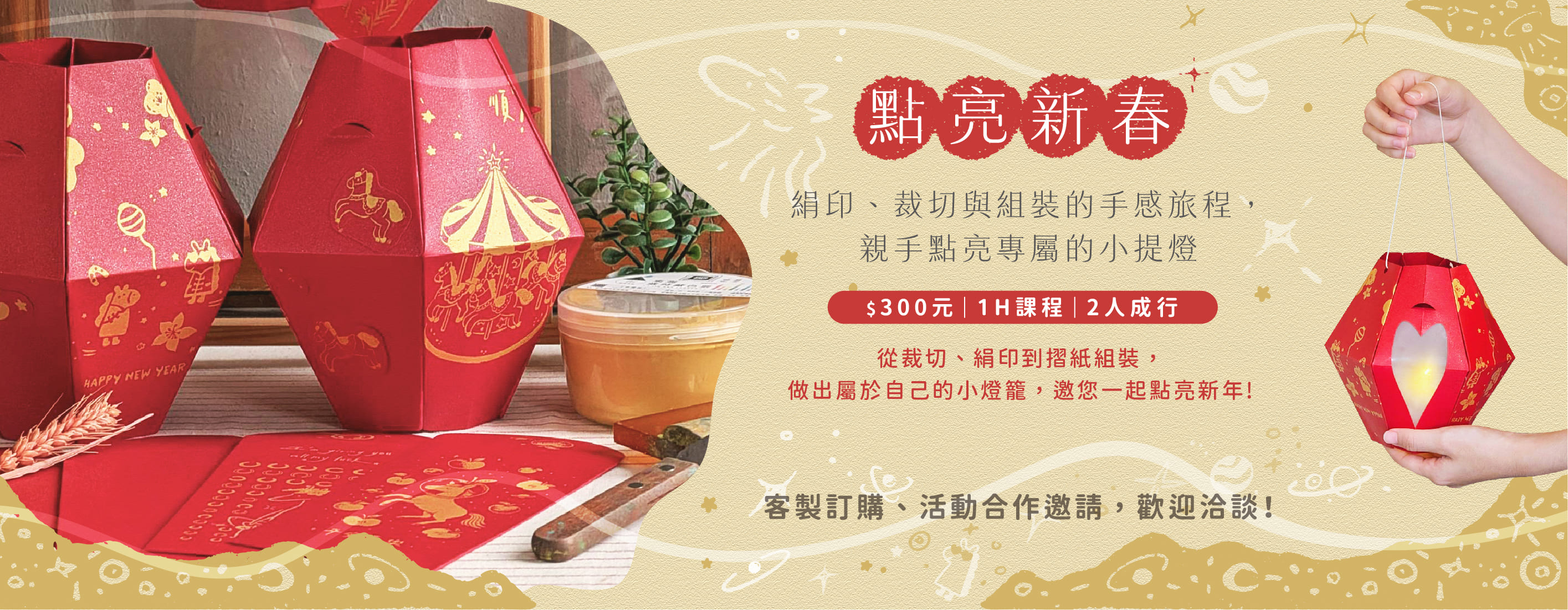 無論是個人創作、小工作室贈品、公司或活動客製化活動或體驗,想在新春來臨之際增加一些年節氣氛或是添上自己的心意,歡迎參加我們的各種春節絹印的活動或課程;各種品項也都可以適用於活動合作或是客製化訂單,歡迎洽詢!